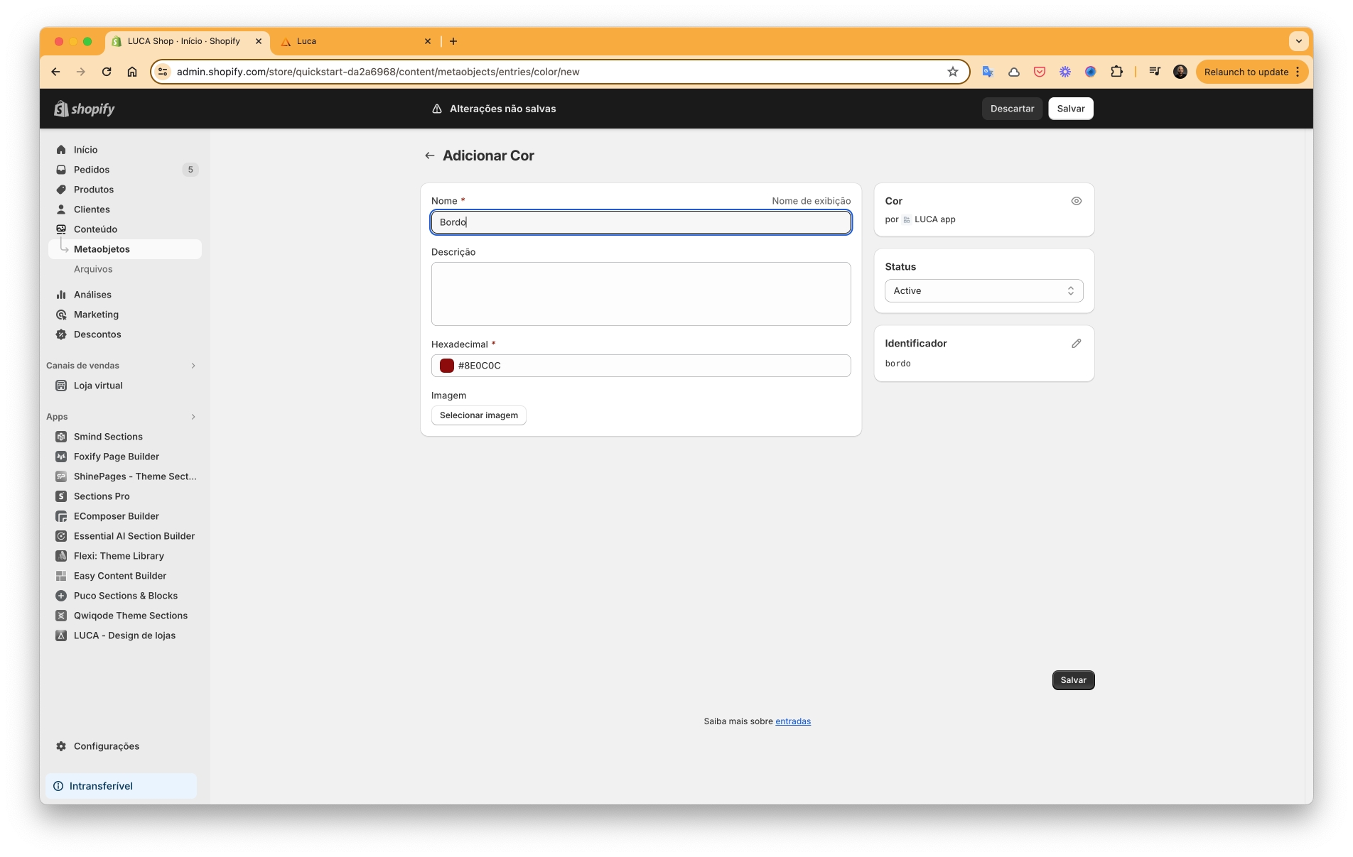 A Estrutura de cores é uma funcionalidade automatizada do LUCA que possibilita a configuração de variações de cores em produtos por meio de metacampos. Através dos metacampos, é possível customizar os seletores de cores, utilizando código hexadecimal para identificar as cores ou até mesmo uma imagem.