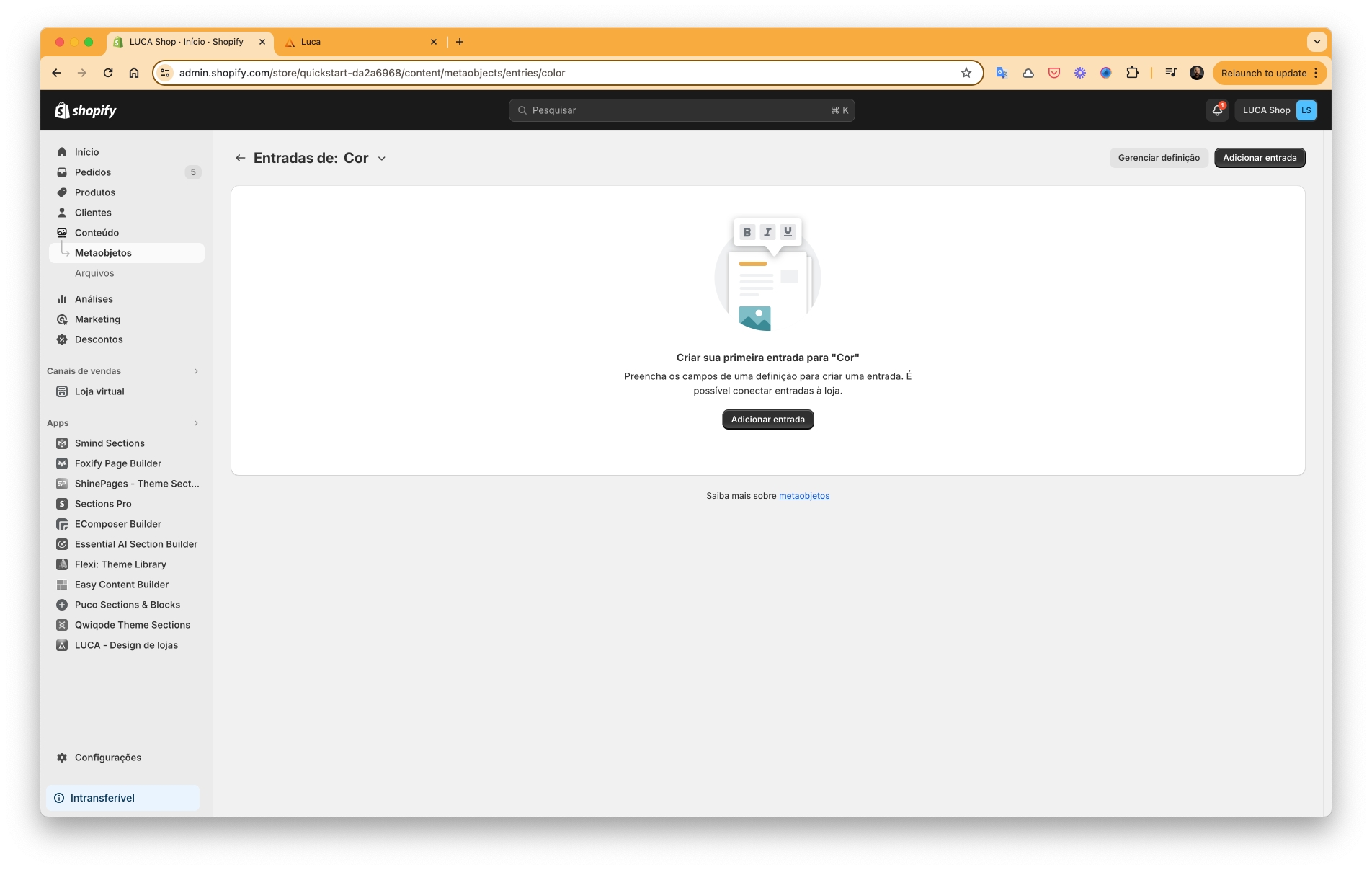 Vá para o seu projeto no Shopify e acesse Conteúdos > Metaobjetos.
