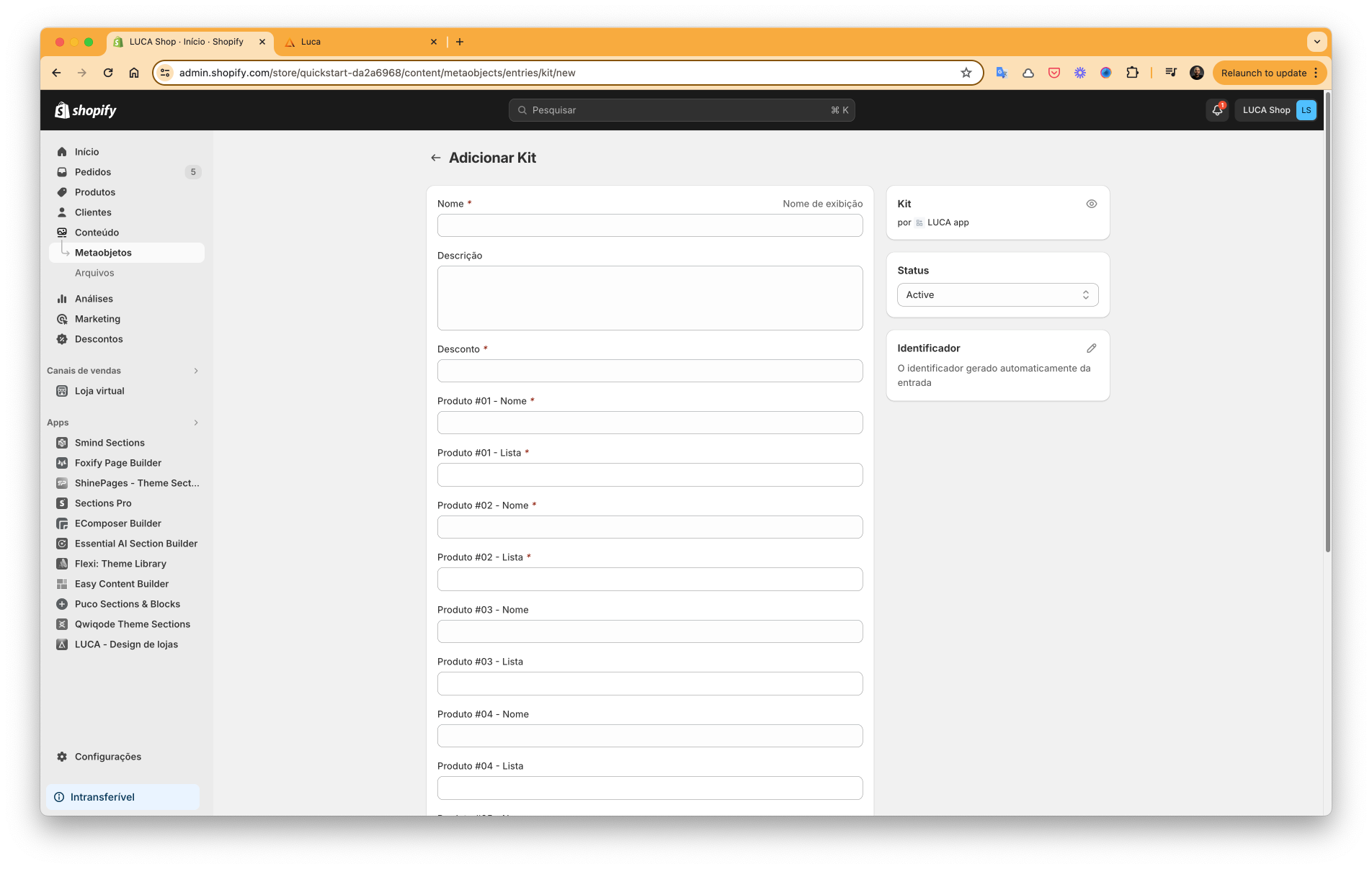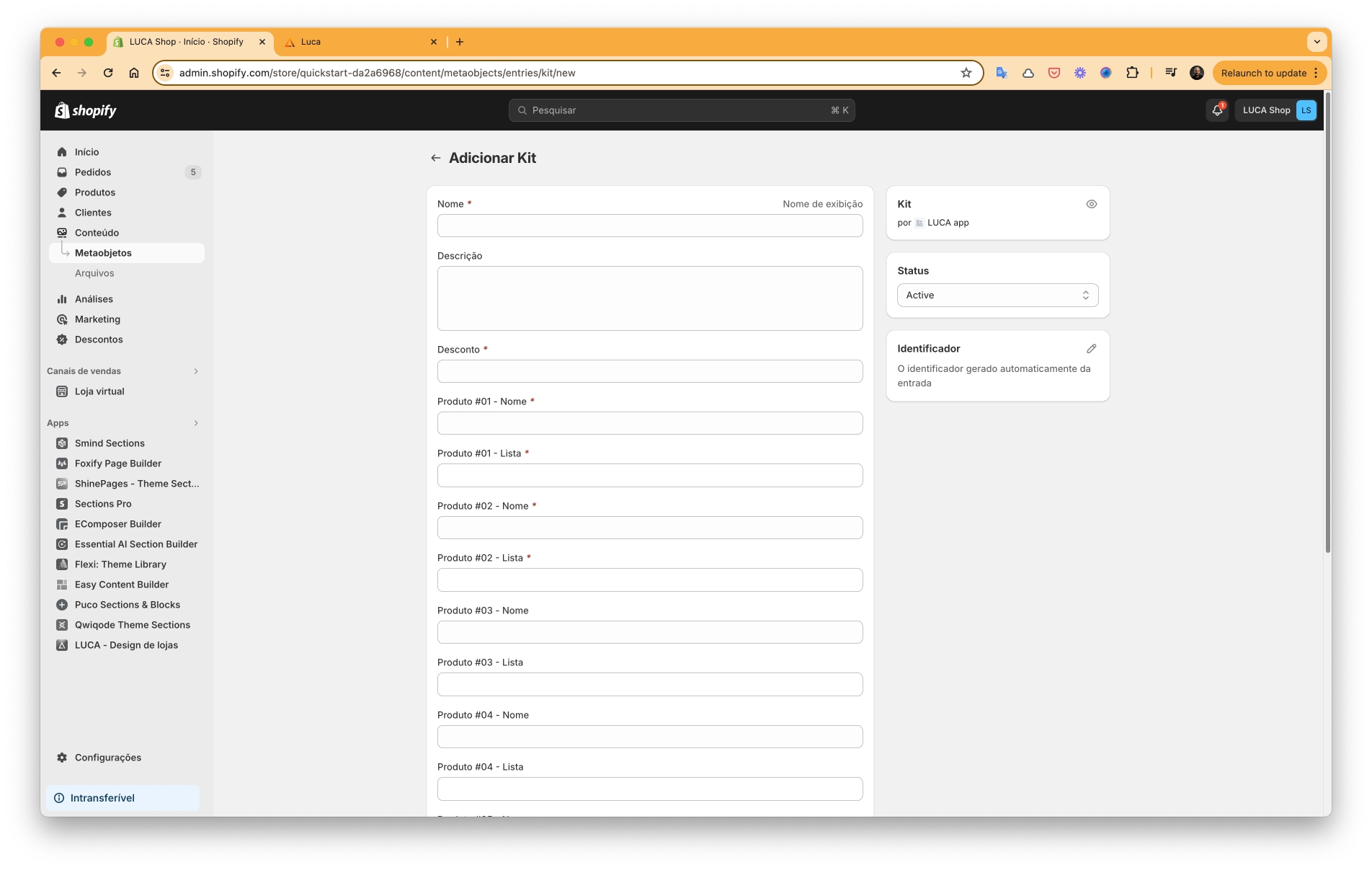 Acesse Conteúdo > Metaobjetos > Kit.