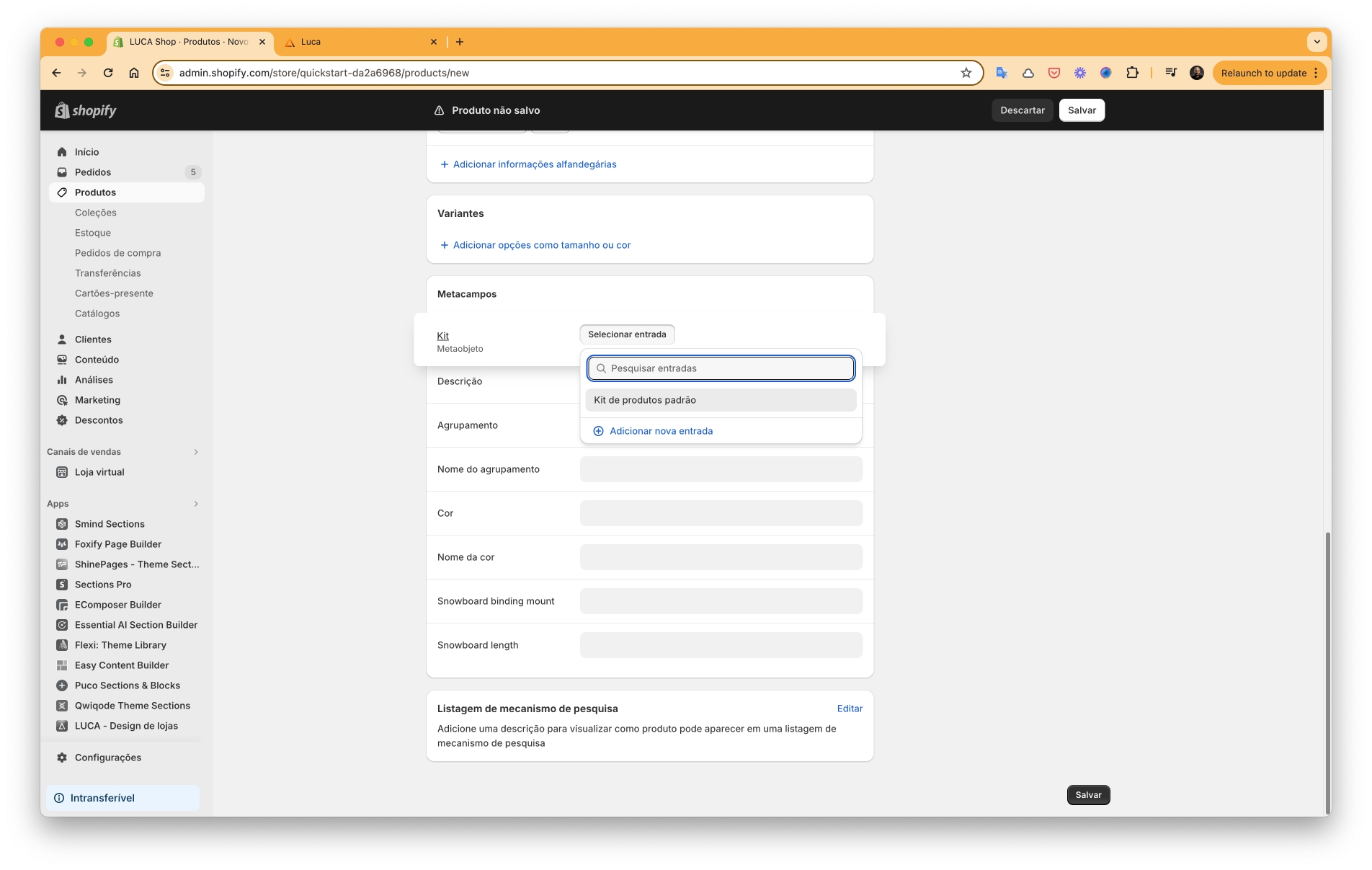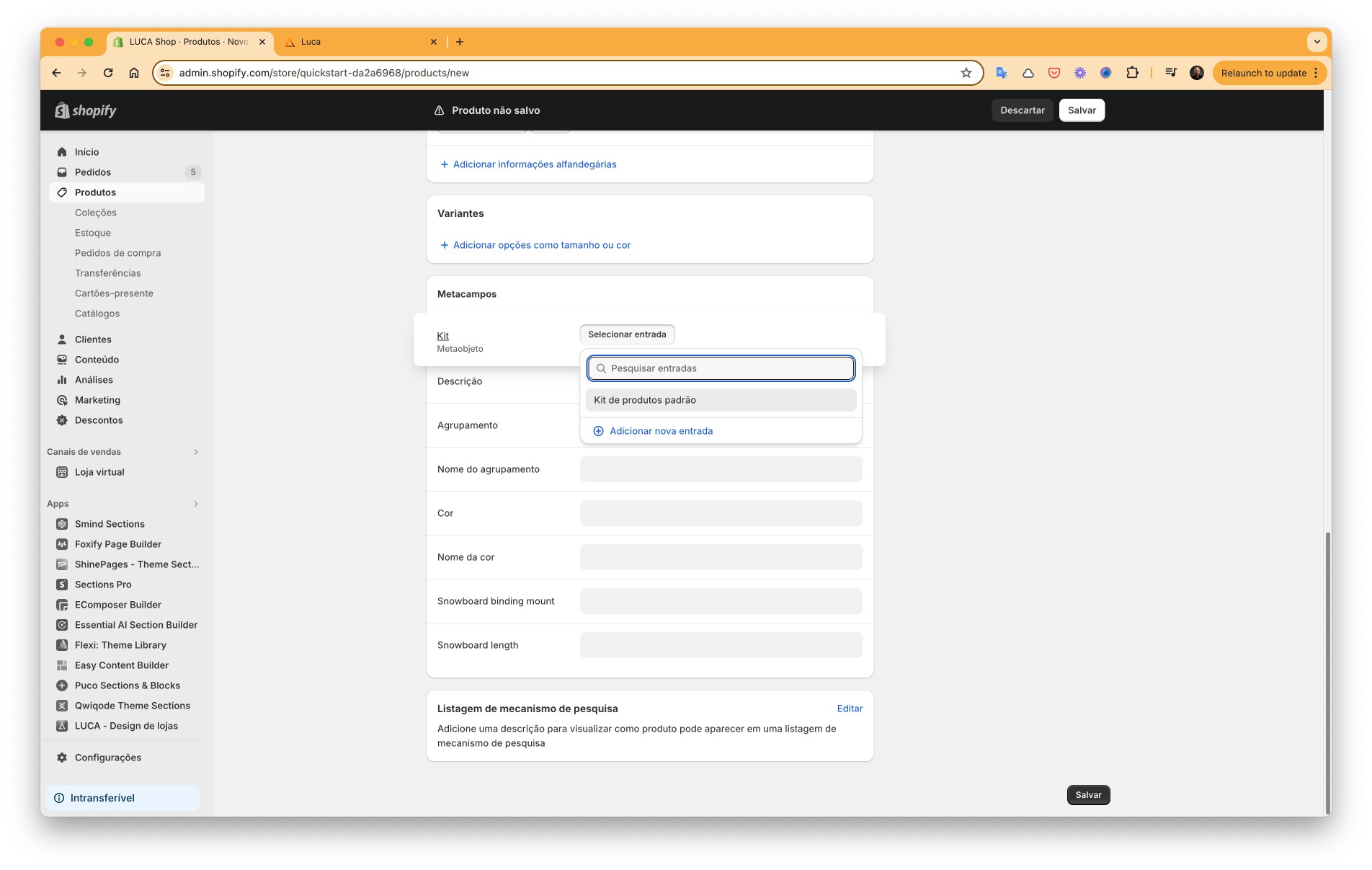 Nos Metacampos do Produto, selecione o kit correspondente e clique em Salvar.