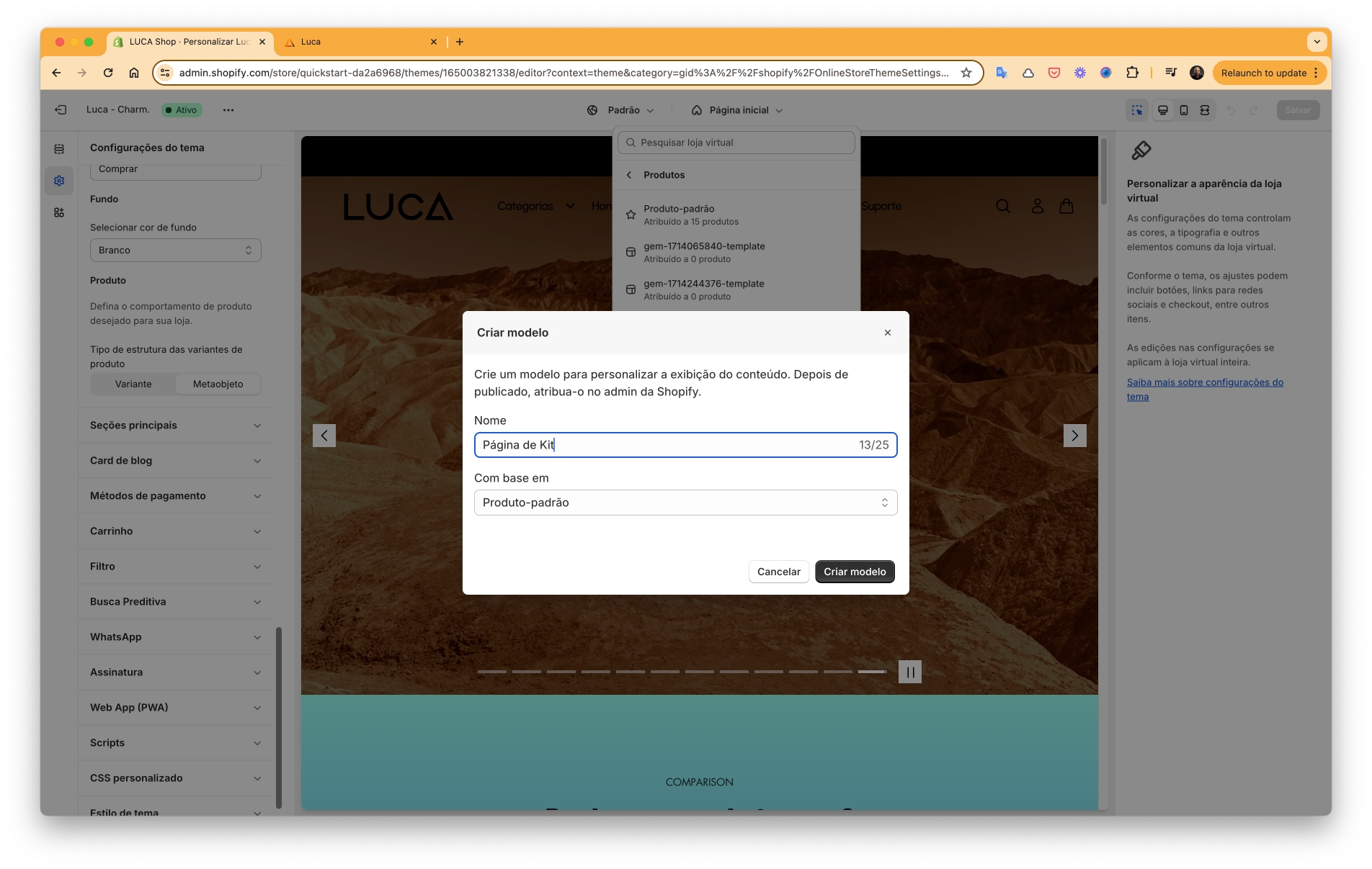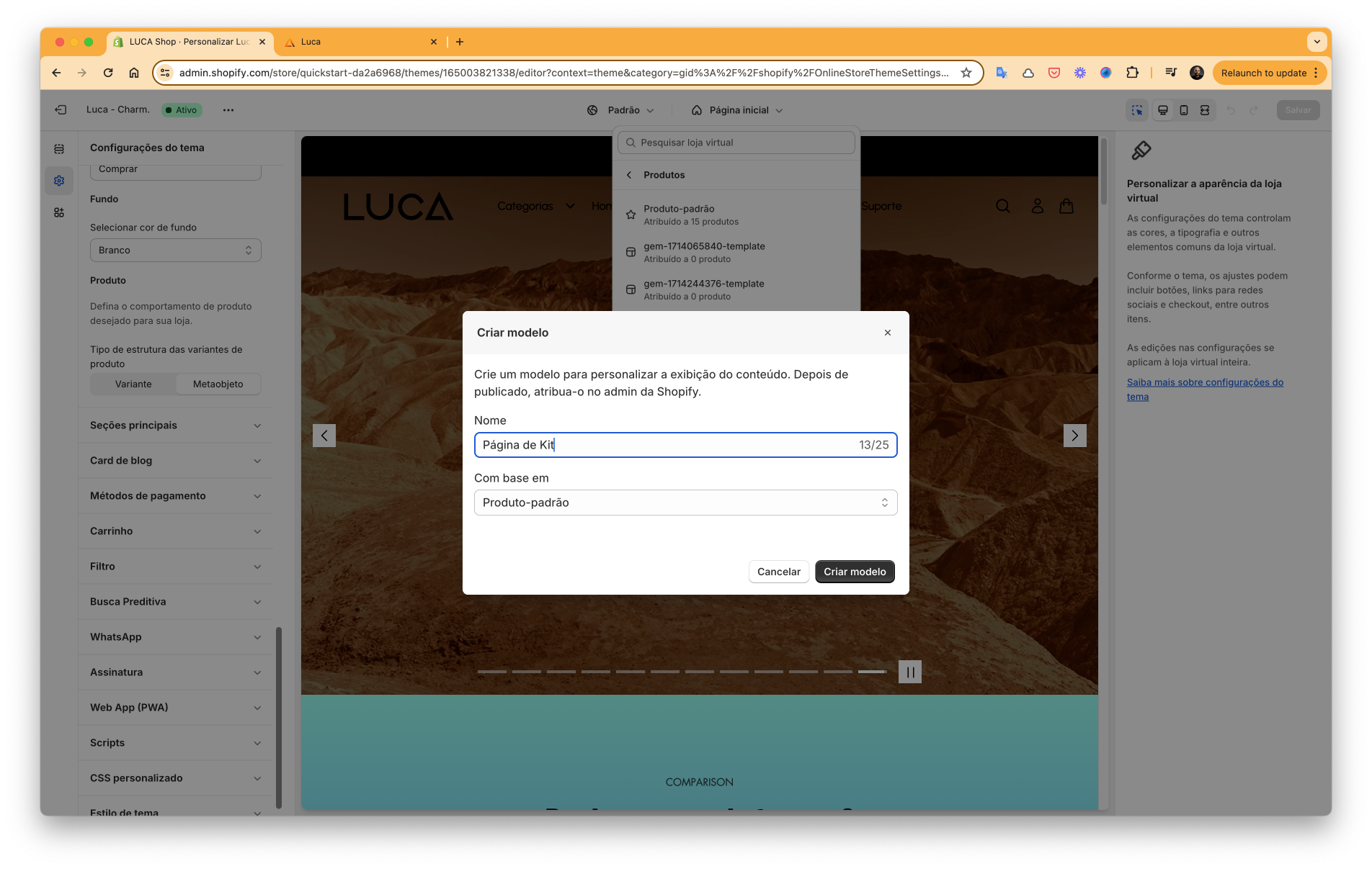 Encontre o tema do LUCA e clique em Personalizar.